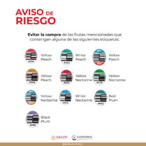 Esta autoridad sanitaria emitió un aviso de riesgo para alertar a la población que estos productos fueron importados a México desde Estados Unidos entre el 1° de mayo y el 15 de noviembre de 2023, por lo que exhorta a la población a que, previo a adquirir las frutas antes mencionadas, se revisen las etiquetas y, en caso de que sean como el cuadro que se muestra a continuación, se deberá evitar la compra:
