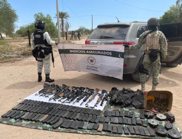 En el estado de Sonora, integrantes de la Guardia Nacional en coordinación con elementos del Ejército Mexicano, aseguraron una camioneta abandonada con armas largas, cargadores, cartuchos útiles y una granada de fragmentación.