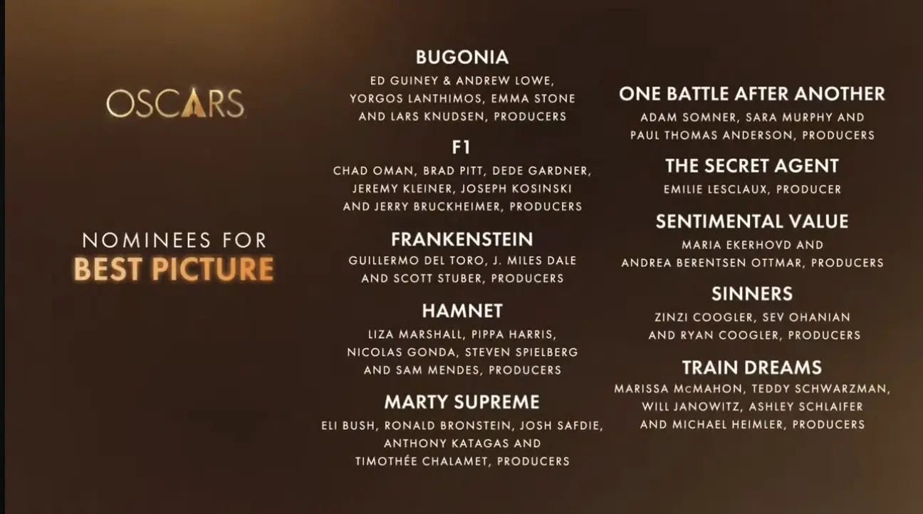 Las 10 producciones nominadas para Mejor Película son “Bugonia”, “F1”, “Frankenstein”, “Hamnet”, “Marty Supreme”, “Una batalla tras otra”, “El agente secreto”, “Valor sentimental”, “Pecadores” y “Sueño de trenes”.